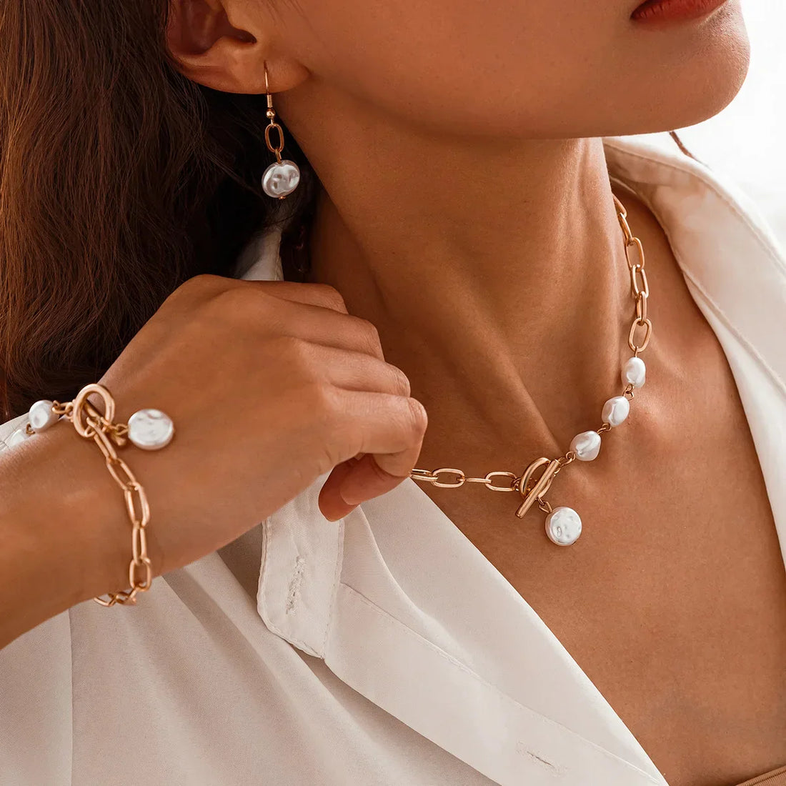 Classy Paperclip Pearl Necklace, Bracelet, and Earrings Set