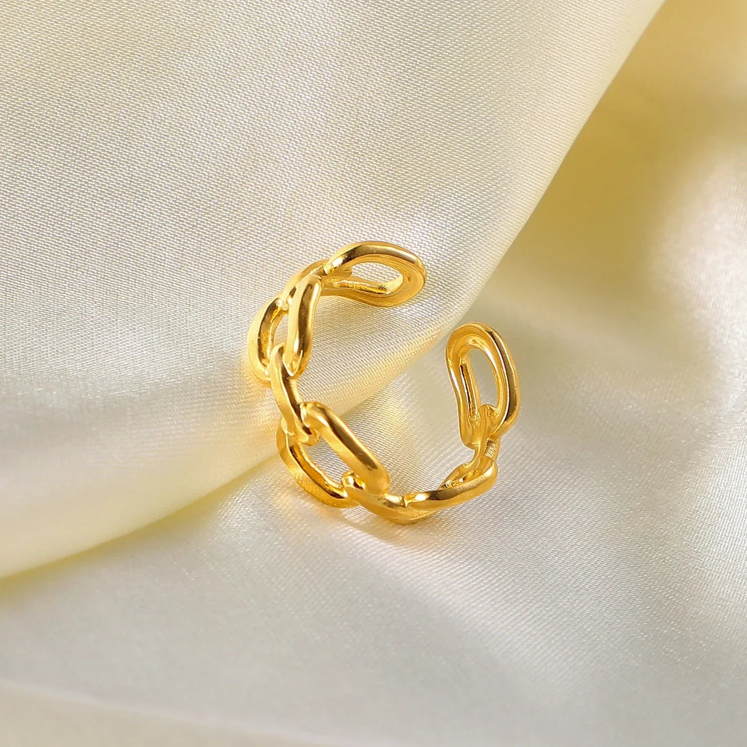 Introducing the 18k Adjustable Elegant Chain Linked Ring by Zyrah Jewels, a sophisticated piece that embodies understated luxury and modern elegance. Perfect for those who value timeless design with a touch of refinement.