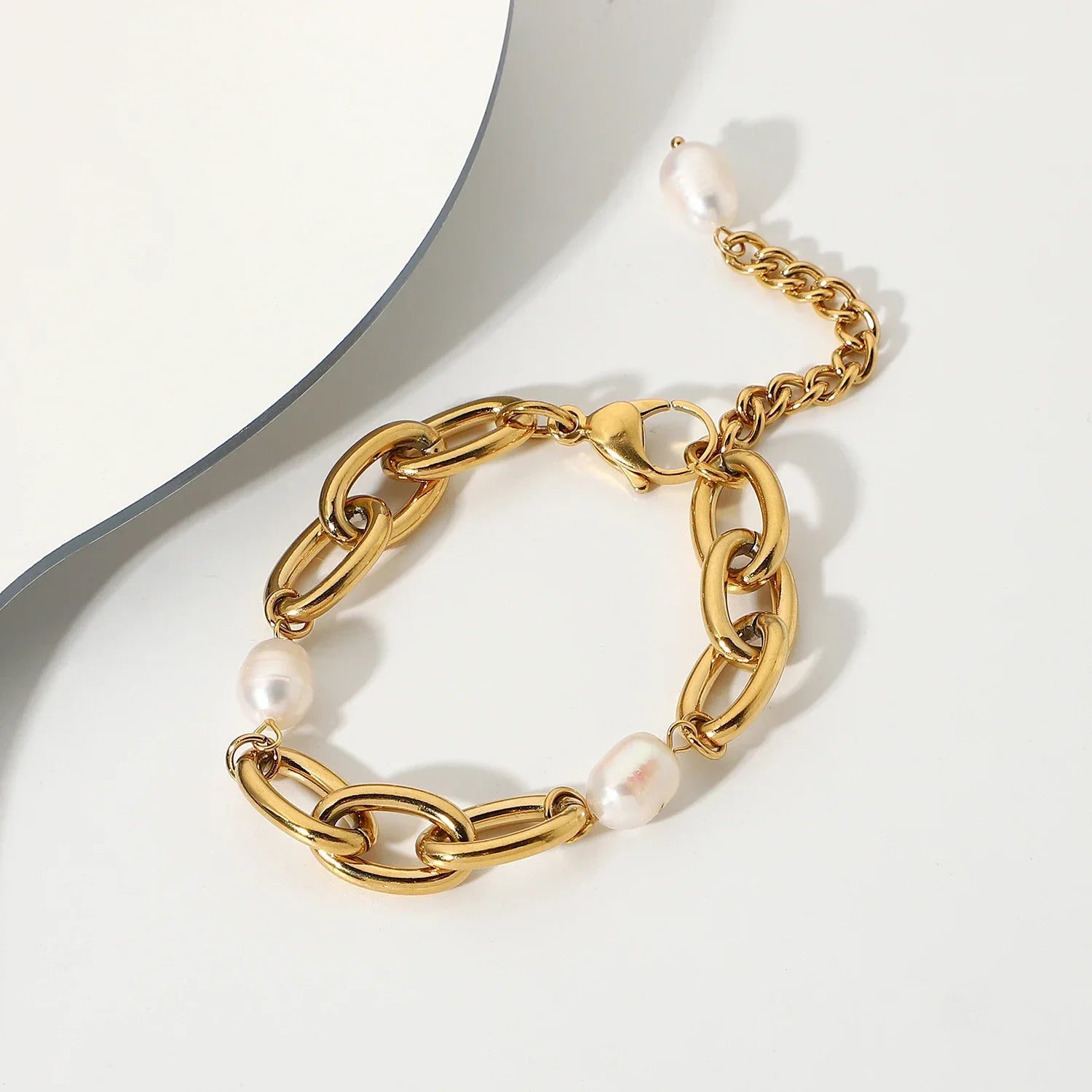 - Style: This bracelet features a series of chunky, elongated paperclip links that exude a bold yet refined presence. Every three links, a lustrous oval pearl is seamlessly integrated, adding a soft, elegant contrast to the boldness of the golden chain. The design is completed with an additional pearl delicately placed at the end of the extender, offering a touch of sophistication and grace to an already stunning bracelet. The interplay of the strong, geometric links and the softness of the pearls makes this piece versatile for both formal and casual settings.