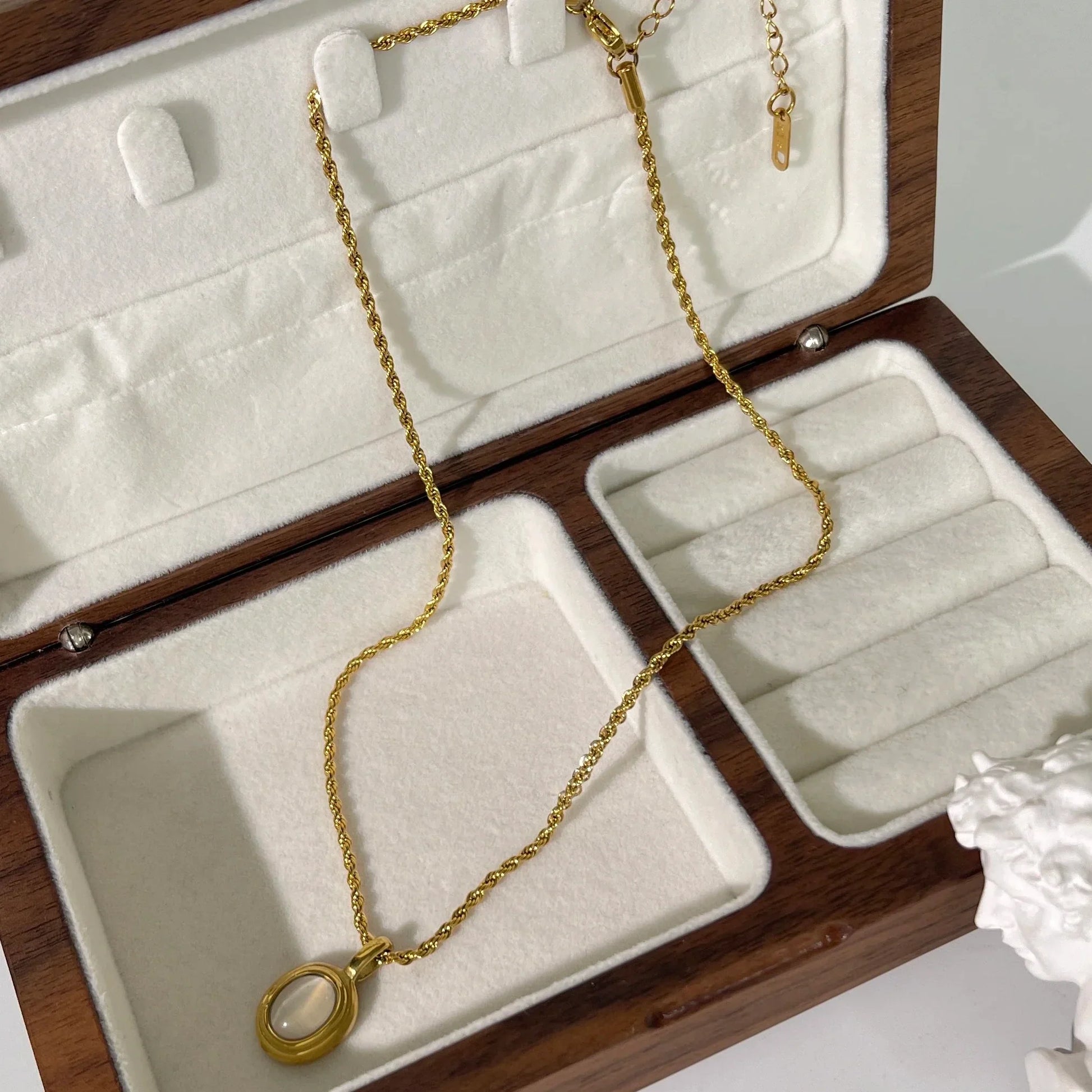 - Style: Features a vintage-inspired design with a delicate gold chain and an oval gemstone pendant, beautifully accented in gold, exuding an aura of refined elegance.