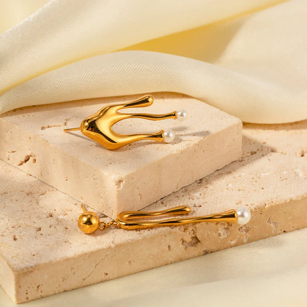 - Style: Polished golden stud earrings crafted with an artistic melted look. Each earring showcases a slightly different shape, creating an asymmetrical yet harmonious design. One earring is thinner, ending delicately with a single dainty pearl, while the other is wider, with two pearls nestled within the molten gold finish. This asymmetry adds a playful sophistication to the set, perfect for enhancing both casual and formal outfits.