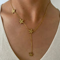 - Two-Flower Design: Features a dainty thin gold chain with two floral accents at the center, from which the chain elegantly dangles below, creating a light and airy tassel effect.