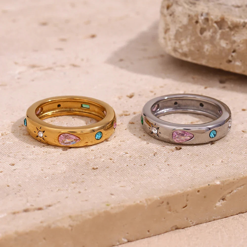 Introducing the 18k Gem Pop Ring by Zyrah Jewels, a vibrant and luxurious piece that combines simplicity with a burst of color. Perfect for those who love adding a touch of playful elegance to their jewelry collection.