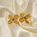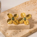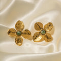 - Style: These stunning stud earrings feature a four-petal floral design, each petal beautifully textured to create a soft, natural appearance. The center of the flower is adorned with a vivid green stone that adds a captivating contrast against the radiant gold. The combination of the textured petals and the vibrant green stone gives these earrings a sophisticated yet lively aesthetic, making them perfect for adding a hint of color to any ensemble.
