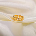 - Style: This dainty ring features a dual-layered band design adorned with tiny, oval-shaped beads that gently wrap around the finger. Its layered structure creates a subtle yet distinctive texture, making it a standout piece despite its minimal appearance. The open bottom allows for easy resizing, ensuring a tailored fit. Whether worn alone for a delicate accent or stacked for a modern touch, this ring embodies understated elegance.