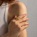 - Material: Crafted from 18k gold plated 316L stainless steel, this ring is hypoallergenic, tarnish-resistant, and designed for lasting durability and shine. The stones are meticulously cut to catch and reflect light, enhancing the ring’s vibrant and luxurious appeal.