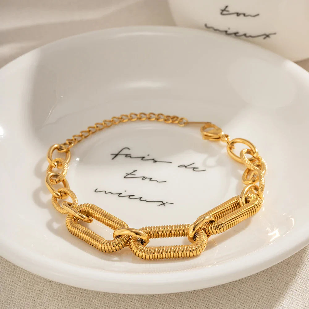 - Style: This gold bracelet features bold, chunky links alternating between smooth and textured finishes, creating a striking visual contrast. At the top, three oversized paperclip-style links with a rigid, textured design add depth and dimension, connected seamlessly by smaller links. The combination of textures and link sizes makes this bracelet a standout piece, perfect for adding flair to any outfit.