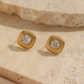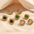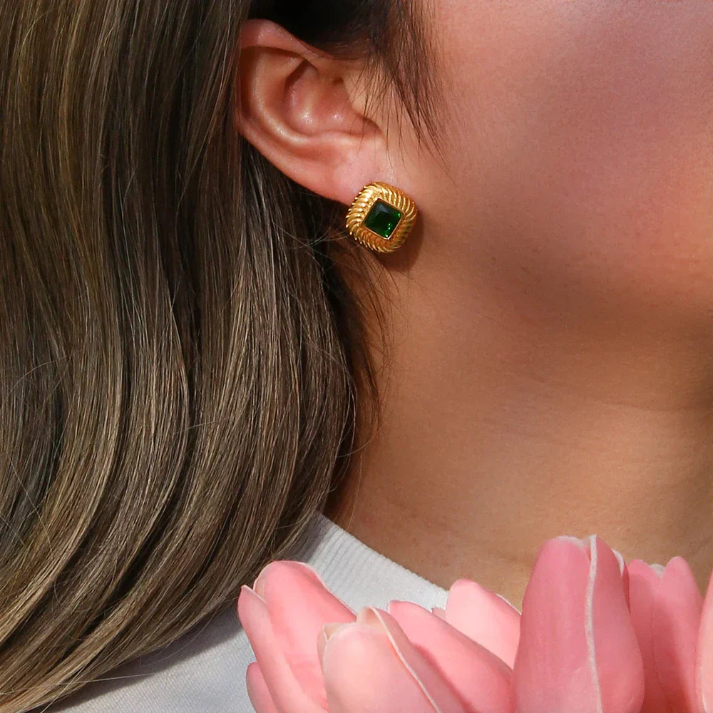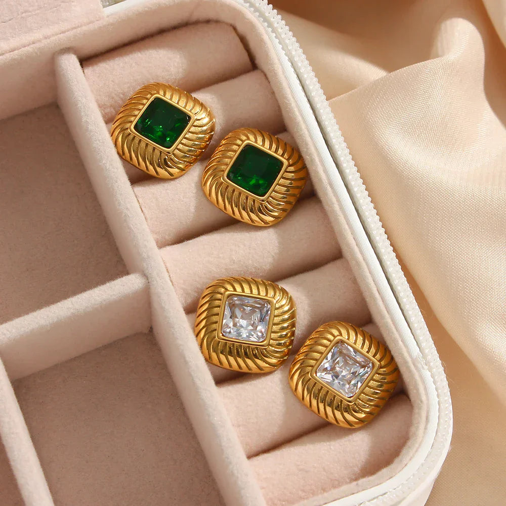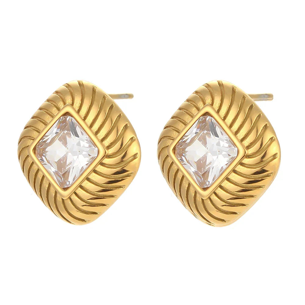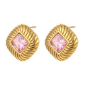 - Style: These earrings feature a rounded square design with a wide, spiral-textured gold outline that adds depth and sophistication. At the center, a striking square diamond takes center stage, available in various colors—white, black, green, or pink—allowing you to choose the perfect hue for your style.