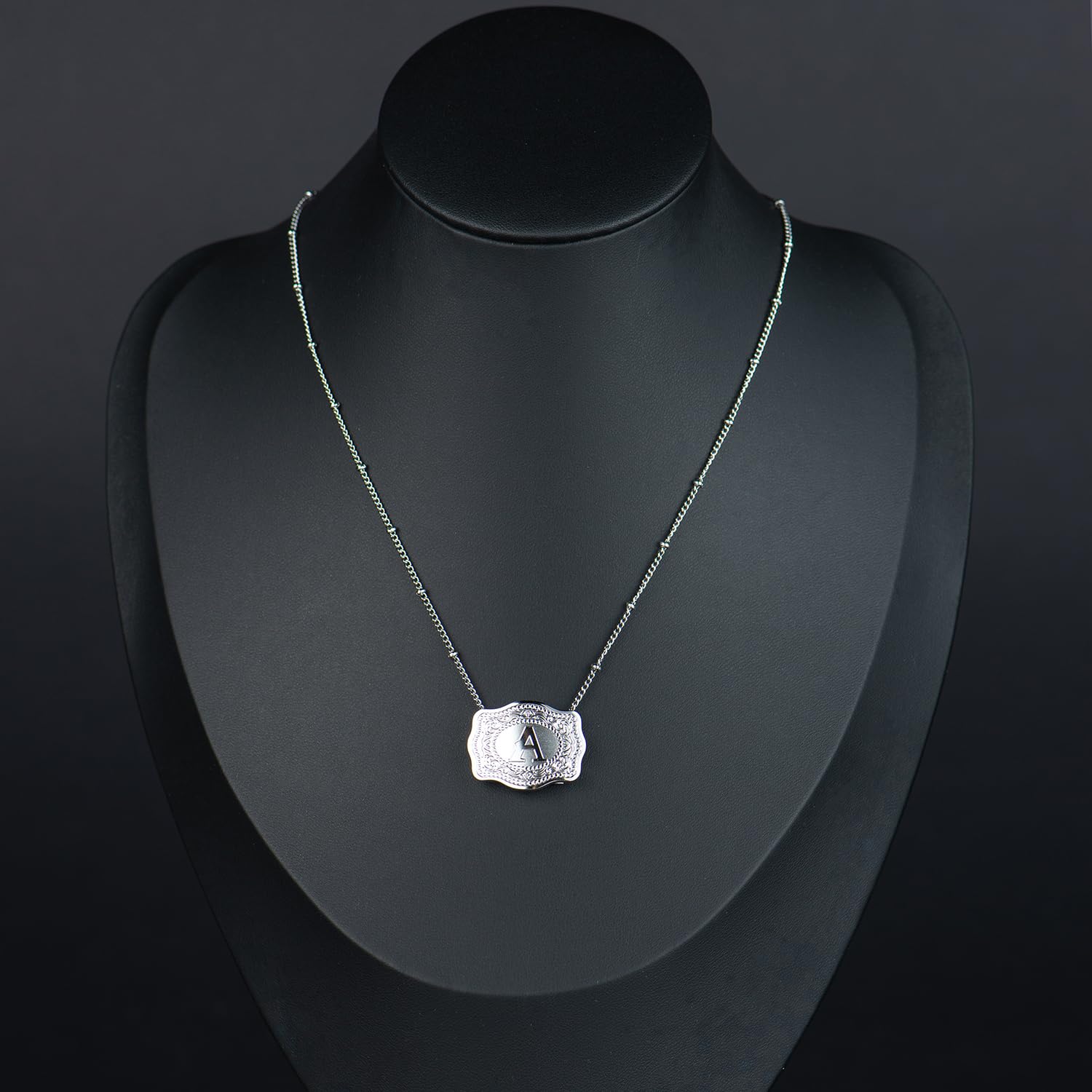 - Style: This necklace features a petite belt buckle pendant, styled with intricate detailing that captures the essence of rugged country charm. At the center of the buckle sits a personalized initial, adding a distinctive and meaningful touch to the design. Whether you're dressing up for a rodeo or adding flair to your everyday outfit, this piece channels pure cowgirl energy with effortless confidence.