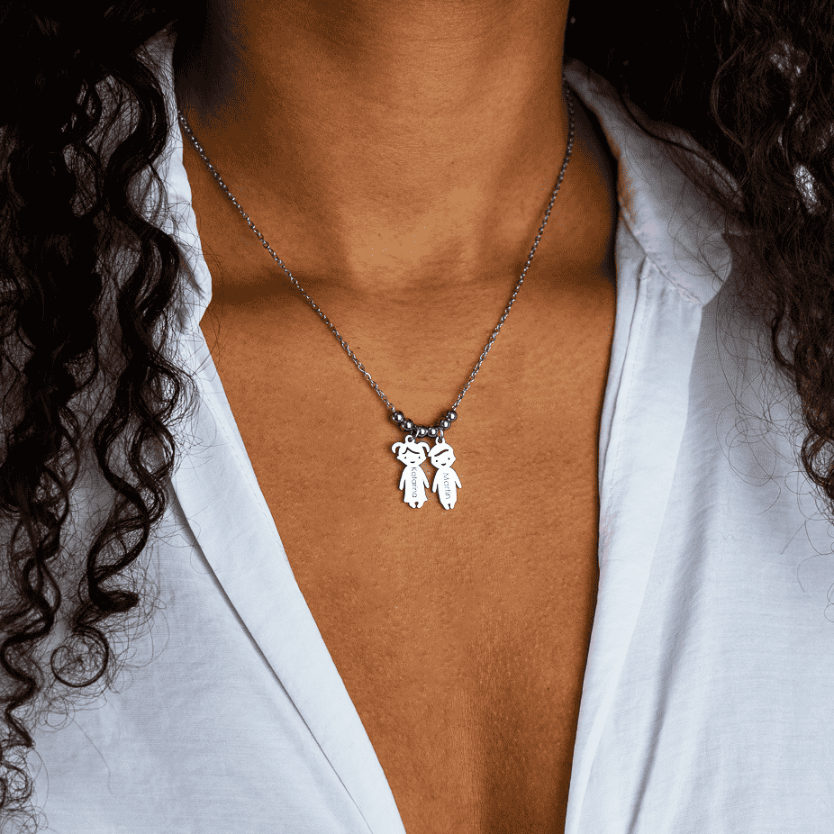 - Style: This necklace features a refined dainty chain adorned with six small beads evenly placed at the bottom, adding a touch of elegance and balance to the design. Personalize it with up to five dainty charms, which can be customized as either a little boy or little girl, each engraved with a special name. The thoughtful arrangement allows you to wear the essence of your family’s love and connection, making it a deeply personal accessory.