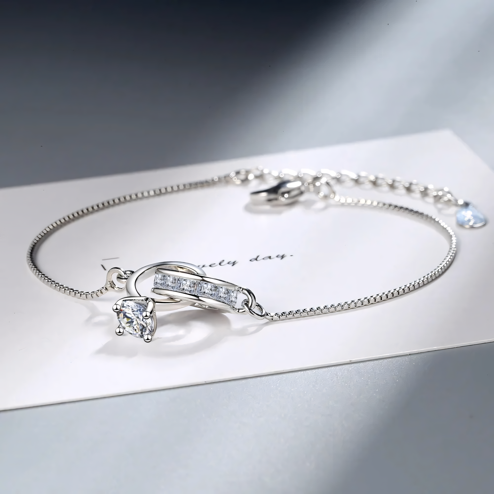 - Style: Featuring an intricate chain bracelet with two interconnected circles, this design speaks to unity and lasting bonds. One circle is embellished with radiant diamonds, while the other evokes the brilliance of a diamond ring, complete with a dazzling centerpiece, adding an elegant touch of sparkle.