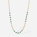 - Style: This necklace features a delicate golden chain that beautifully alternates between sets of five vibrant malachite stone beads and four lustrous gold beads. The interplay of rich green malachite and polished gold creates a balanced, eye-catching pattern, symbolizing harmony and strength. The minimalist design, combined with the striking colors, makes it perfect for adding a subtle yet impactful touch to any outfit.