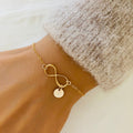 - Style: This dainty gold chain bracelet features an elegant infinity symbol at its center, representing everlasting love and connection. A dainty circle charm, engraved with an initial, is nestled within the hoop of the infinity, adding a personalized touch to the minimalist design. The simple yet sophisticated look makes it ideal for both everyday wear and special occasions.