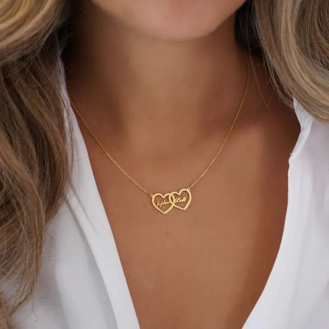 - Style: This necklace features a delicate, thin chain with an intersected dual heart design, each heart customized with a name. The intertwined hearts symbolize unity and love, making it a meaningful gift for couples, best friends, or family members. The dainty and elegant design ensures that this necklace is versatile enough to be worn daily or on special occasions, adding a touch of personalized charm to any outfit.