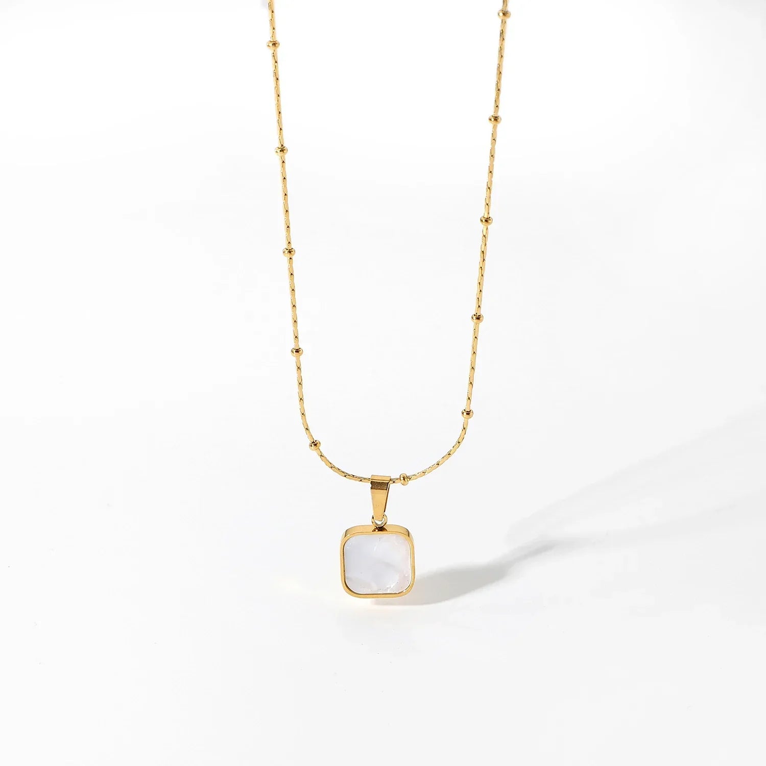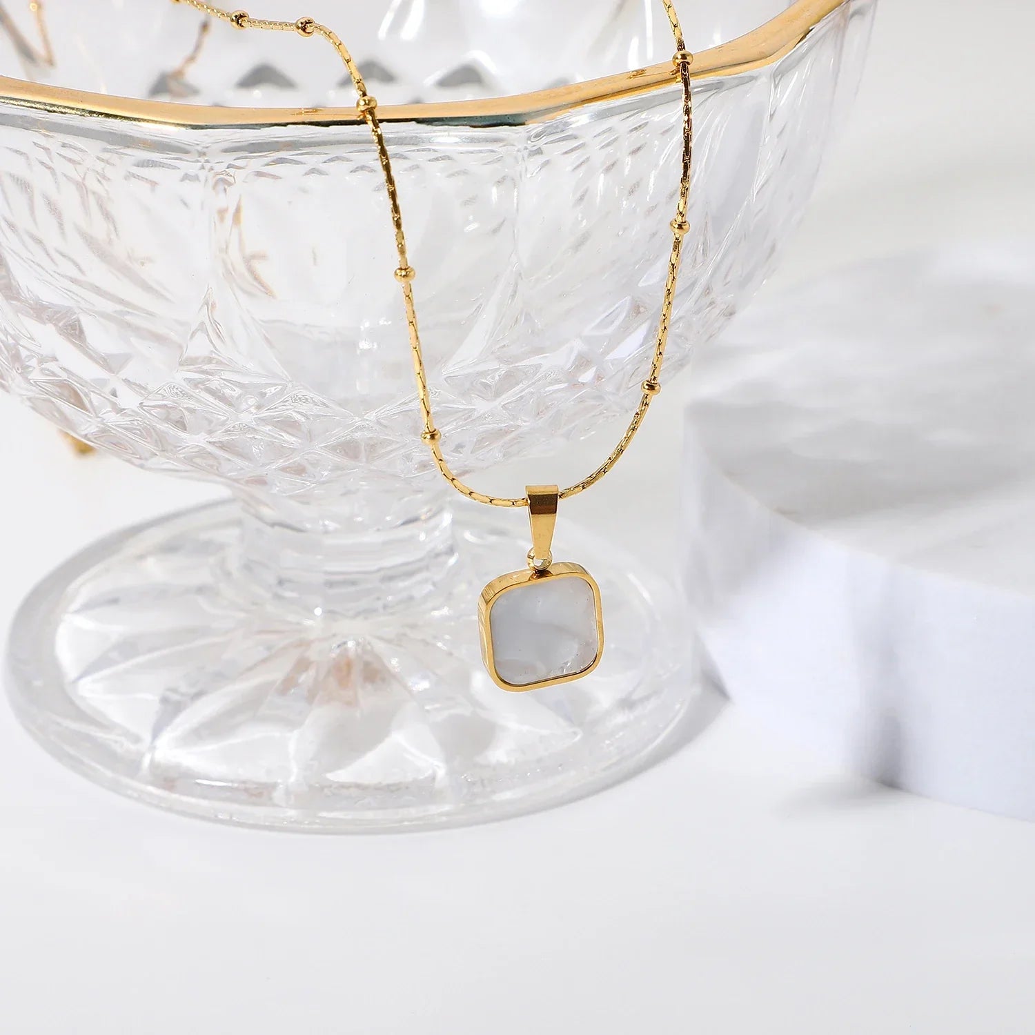 - Style: This necklace features a dainty golden satellite chain, accented by a softly rounded square shell pendant. The natural iridescence of the shell adds a subtle shimmer that catches the light beautifully, while the rounded edges of the pendant give it a gentle, harmonious appeal. The satellite chain’s tiny spaced beads add an additional layer of elegance, making this necklace a perfect blend of minimalist sophistication and organic beauty.