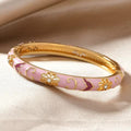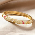 - Style: Each bangle features a smooth golden finish, accented with a glossy acrylic inlay that adds both personality and polish. The floral-inspired color tones—soft pink, sunny yellow, serene blue, and crisp white—offer versatile styling options for any outfit or mood. With their bold yet feminine design, these bangles can be worn solo or stacked together for a brighter, bolder look.