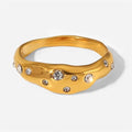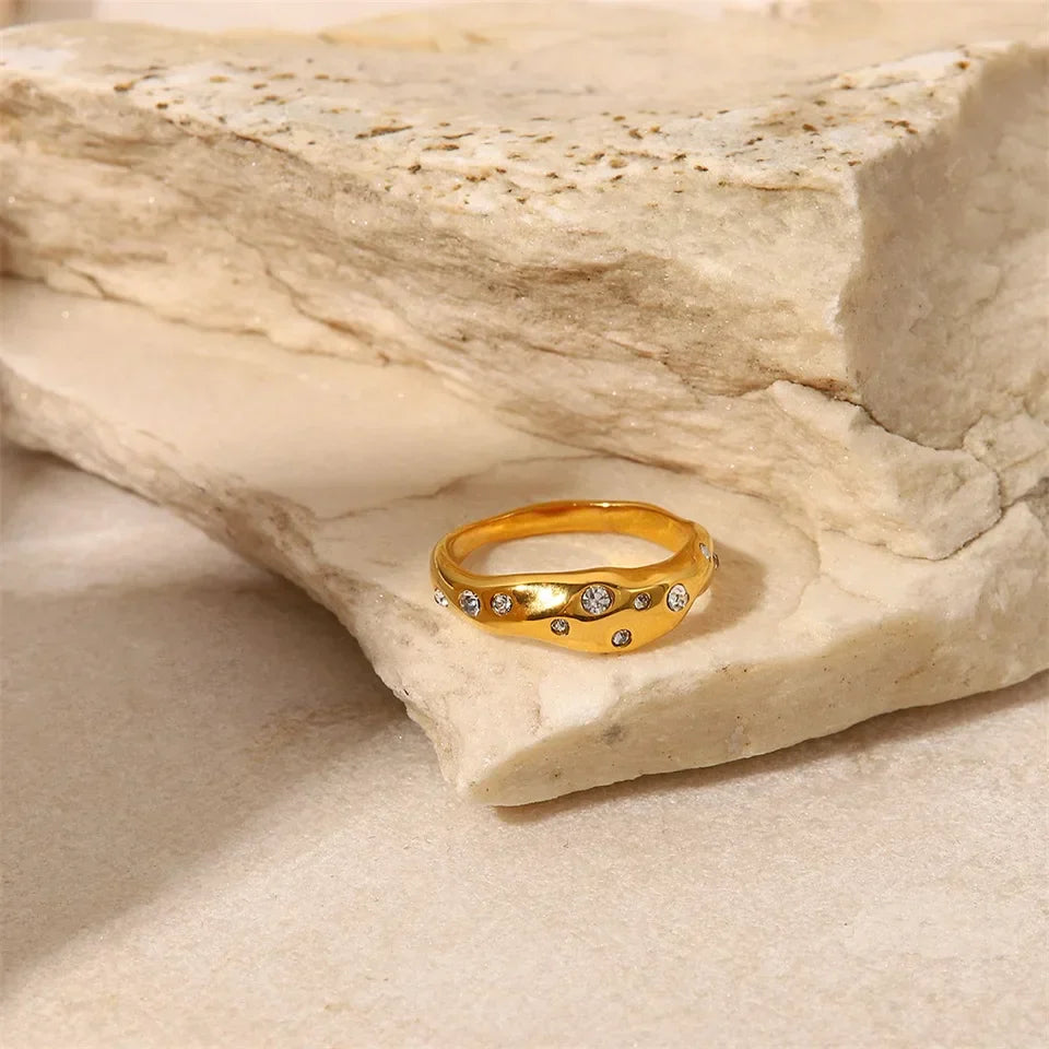 The Gold Diamond Embedded Ring is perfect for those who want to add a touch of modern luxury to their jewelry collection. Its unique, irregular design paired with a delicate scattering of diamonds makes it a versatile piece, suitable for both everyday elegance and special occasions.