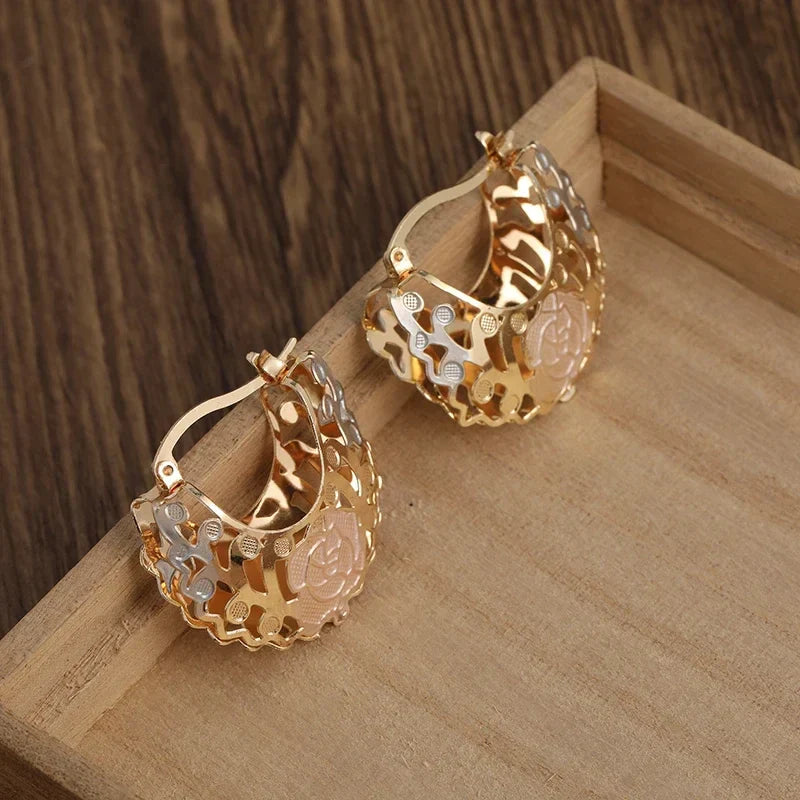 - Style: Features an exquisite open-cut design with numerous cuts, openings, and carvings, highlighted by a small floral motif. The tricolor palette of gold, silver, and rose gold adds a stunning depth and versatility to the piece, creating a harmonious blend of tones.
