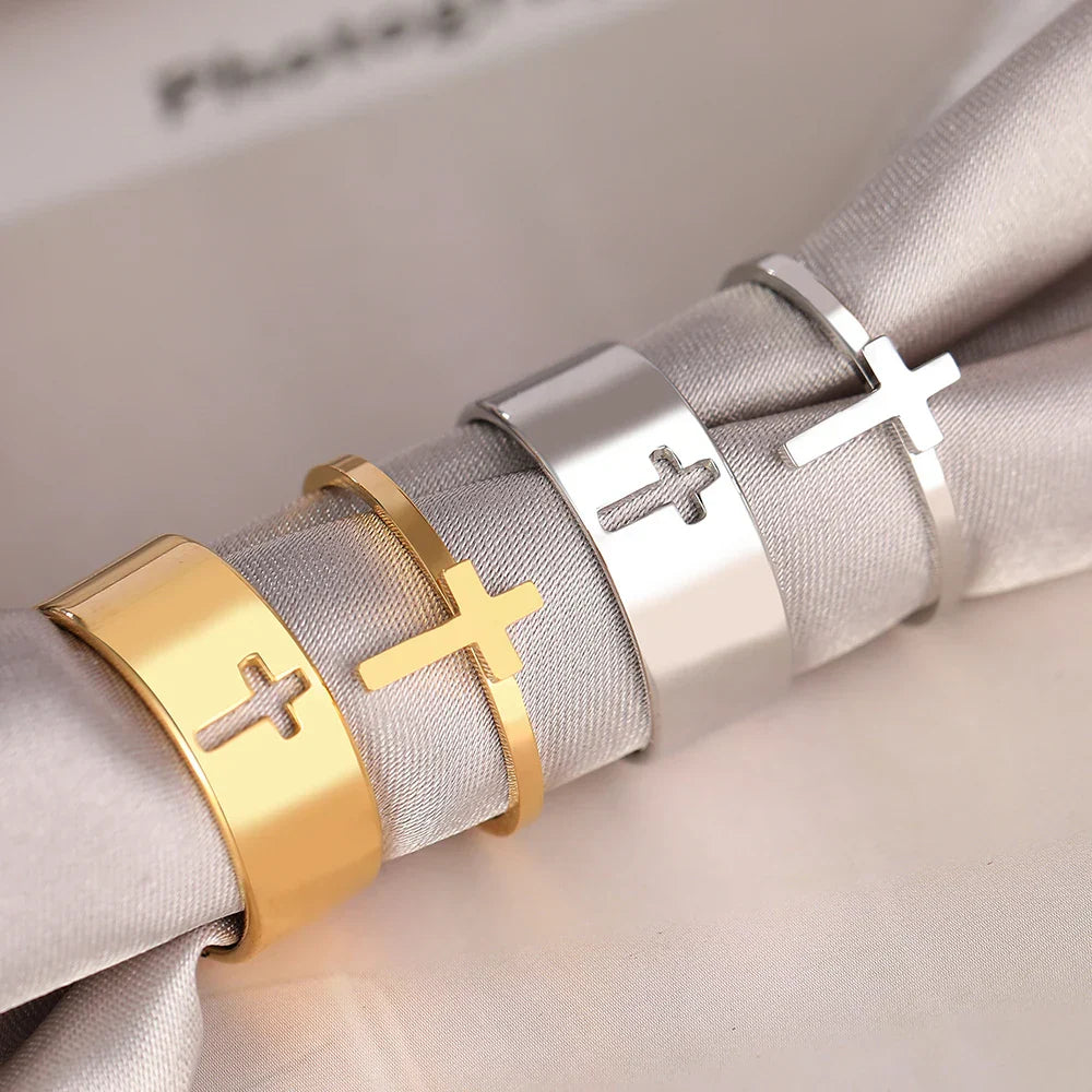 - Style: Both rings are adjustable for a comfortable fit. One features a thicker band with a cross cut-out design, while the other showcases a thinner band with a simple cross accent, creating a harmonious and complementary look.