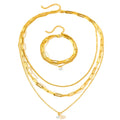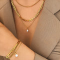 - Style: Features a trio of chains: a bold curb chain, a modern paperclip chain, and a delicate chain link holding a dainty pearl. The same design is mirrored in both the bracelet and necklace, offering a harmonious blend of textures and styles.