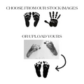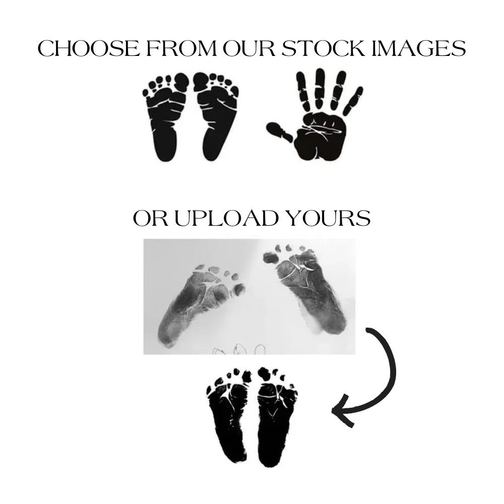 - Style: A gold pendant adorned with a unique melting gold accent border, encircling a customizable center. Upload a footprint, handprint, fingerprint, or any print that holds meaning to you. Below the print, personalize with a name and birthdate, and complete the design with a birthstone dangling beneath.