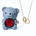 - Packaging: Elevate your gift with a gorgeous bear keepsake available in red, blue, pink, white, purple, light pink, and grey. The bear features a center opening that reveals a beautifully preserved rose, symbolizing everlasting love. Turn the crank mechanism on the outside, and a hidden drawer unveils the engraved necklace, making the unboxing experience as magical as the gift itself.
