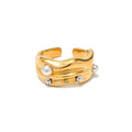 - Style: This chunky ring features a captivating waved crevice texture that adds depth and dimension to the design. Two luminous pearls and two sparkling diamond-like stones are embedded into the golden surface, enhancing its luxurious appeal. The asymmetrical placement of the gems creates a balanced yet dynamic look, perfect for adding a bold touch to your ensemble. The adjustable bottom ensures a comfortable fit, making it an ideal choice for any wearer.