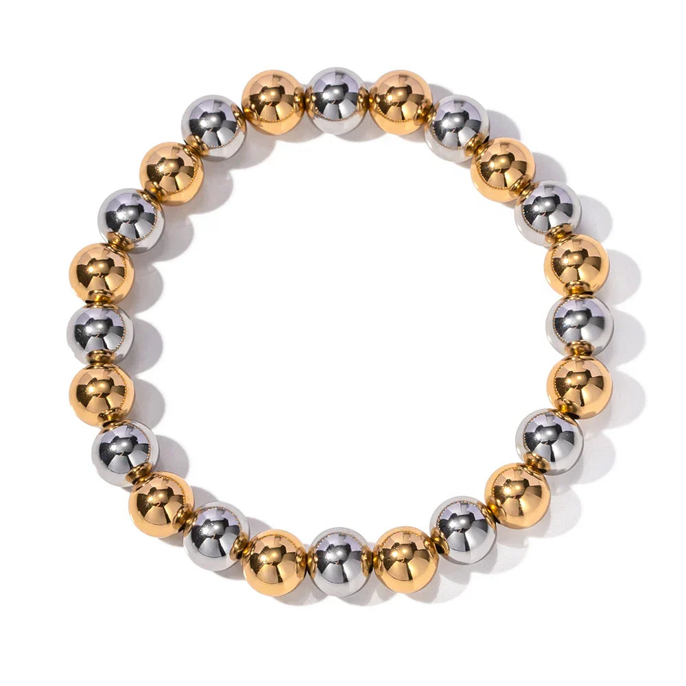 - Style: This elegant bracelet is crafted with alternating gold and silver 8mm beads, creating a minimal yet luxurious design. The two-tone color combination adds a distinct and eye-catching contrast, making it perfect for elevating both casual and formal outfits. The elastic band provides a seamless and comfortable fit, ideal for everyday wear.