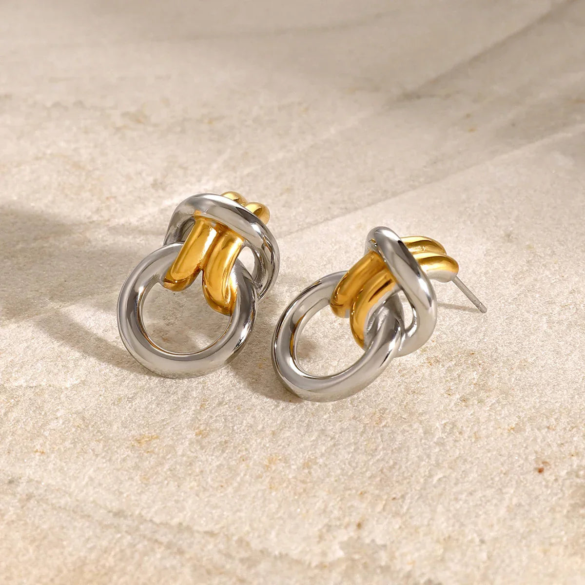 - Style: These earrings feature a sleek circular base in polished silver, enhanced by a dual wrap knot design at the top, accented with a touch of gold. The two-tone combination creates a beautiful contrast, while the knot motif symbolizes unity and connection, making them not only a stylish choice but also a meaningful one. The stud style adds to its refined and versatile appeal.