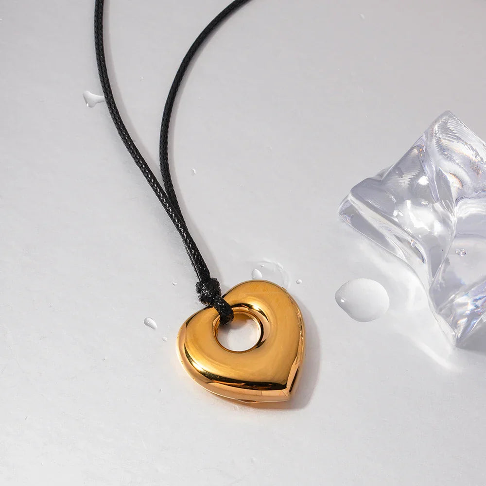 - Style: This necklace features a striking golden heart-shaped pendant with a large circular cutout at the top, creating a vintage-inspired look with a contemporary twist. The pendant’s smooth, polished surface contrasts beautifully with the edgy black leather rope necklace, making it a standout accessory that pairs well with various styles. The leather rope necklace gives it a slightly rugged feel, balancing the pendant’s polished allure.