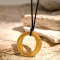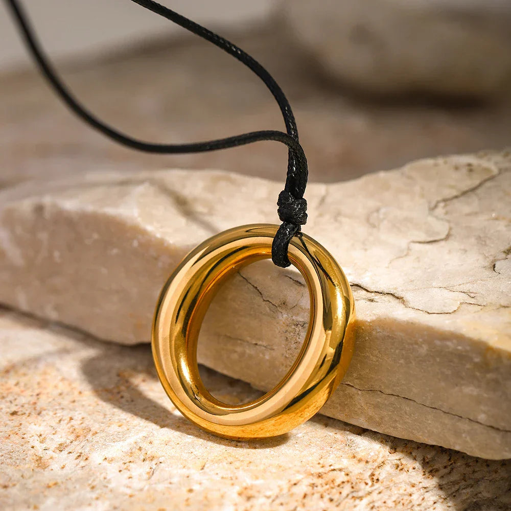- Style: Featuring a golden open circle pendant, this necklace offers a refined look that draws inspiration from vintage aesthetics. The polished, open circle serves as a sophisticated focal point, perfectly complemented by the black leather rope chain for a striking contrast. The pendant’s clean lines and smooth finish add a touch of minimalist elegance, making this necklace versatile enough to pair with casual or formal attire.